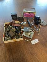 Lot objets de vitrine: Une boîte en bijoux , une boîte à l'imitation de la alque, un étui à cire en métal, un pilulier en métal argenté, un couteau pliant en métal, un stylet en métal doré de carnet de bal, et divers éléments de cachet. EN l'ETAT. Accidents et manques
