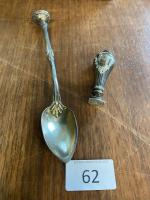Une cuillère en argent et un cachet en argent à décor de style Louis XVI, poinçon Minerve . Poids total : 54 gr. Petits accidents;