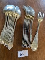 6 couverts en argent à décor feuillagé et de filet, chiffrés, époque 1900 . Poids total 1388 gr. Accidents.