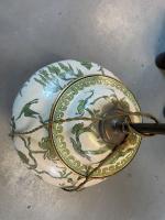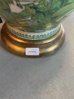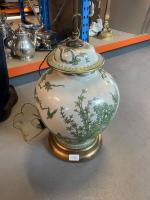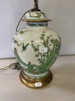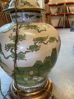 POTICHE couverte en porcelaine à décor en camaïeu de vert à l'imitation de la famille verte de personnages dans des paysages. Percé, monté en lampe, socle en bois doré. H. potiche : 38 cm.