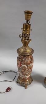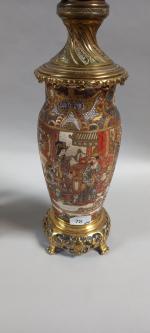 SATSUMA: Paire de vases balustre montées en lampe à décor polychrome et or de scène...