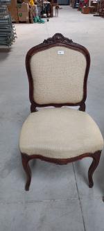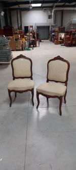 Paire de CHAISES en bois fruitier mouluré et sculpté à décor de coquille, reposant sur des pieds volutés, style Louis XV. Garniture de laine beige. XXème siècle. Accidents dont xylophages