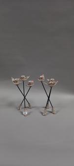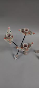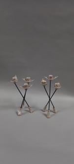 ECOLE ITALIENNE. Une paire de BOUGEOIRS à trois lumières en fer et céramique. Vers 1950. H : 33 cm.