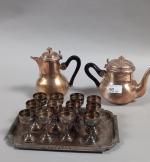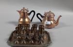 Ensemble en METAL ARGENTE comprenant Théière et cafetière CHRISTOFLE Gallia, 12 verres à liqueur, plateau. Bossués.