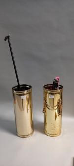 Deux porte-parapluies en métal doré dont un à décor de cordelettes, garni de parapluie et canne. EN L'ETAT, bossués et oxydations.