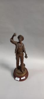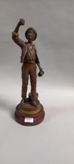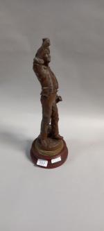 D'après CHAUVIN " Gai Vigneron" statuette en régule reposant sur une base en bois. H totale : 43 cm Manques de patine