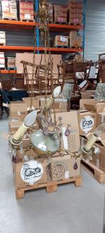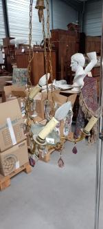 Petit LUSTRE en bois peint vert, monture en laiton doré à trois lumières et pampilles en verre coloré dans le goût néo-classique. XXème siècle (Accidents, petits chocs)
