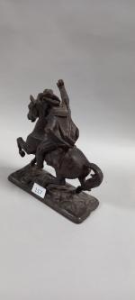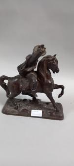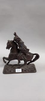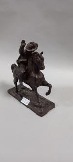 Ecole Française du XXème siècle " Mousquetaire à cheval " régule. Accident et patine usée. H 25 cm.