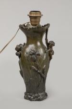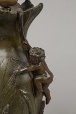 Heingle Vase en régule patiné à décor de putti. Usures, monté en lampe. H. 28 cm. Non testée. TR