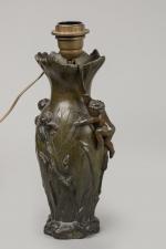 Vase en régule patiné à décor de putti. Usures, monté en lampe. H. 28 cm.