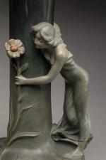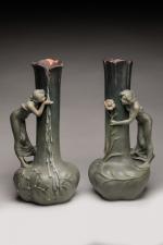 Paire de vases en terre cuite polychrome à décor en haut-relief de femmes buvant à la source ou effleurant une marguerite. Eclats, manques à un col. Signés. H. 41 cm