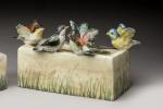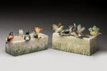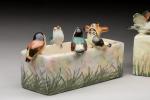 Deux petites jardinières en céramique polychrome avec cinq oiseaux en...