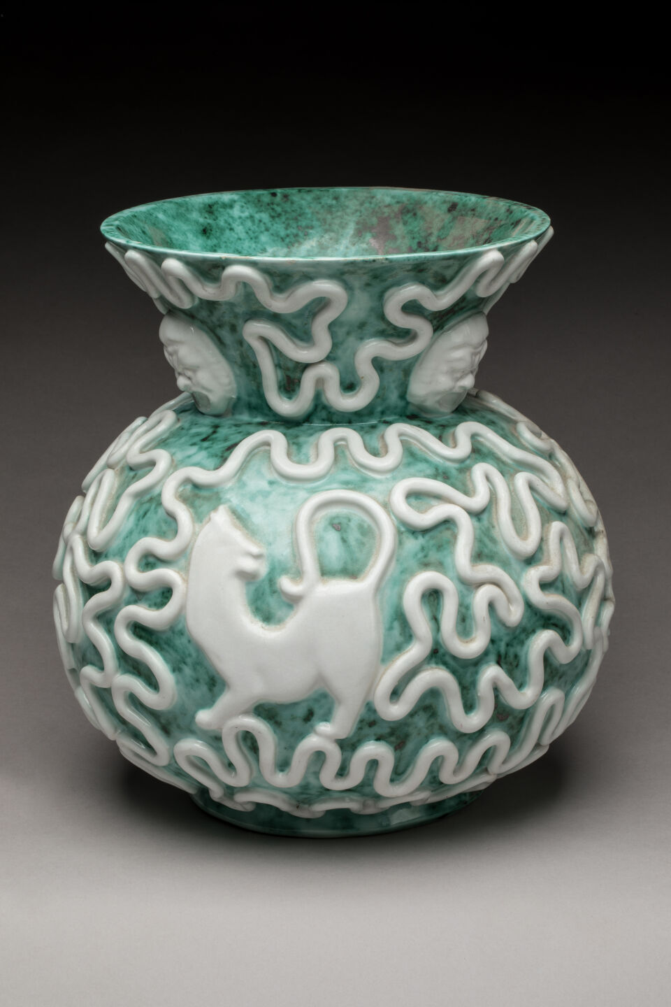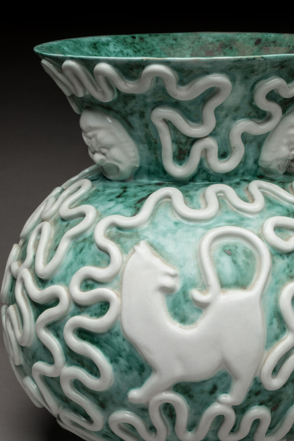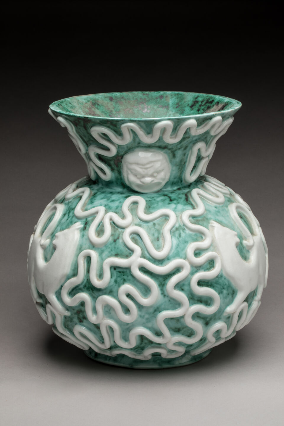 Vase de forme boule en céramique verte nuagée à décor en relief blanc d'entrelacs, mascarons et félins. Petits défauts de cuisson. Marque de Sainte-Radegonde en-dessous. H. 31 cm