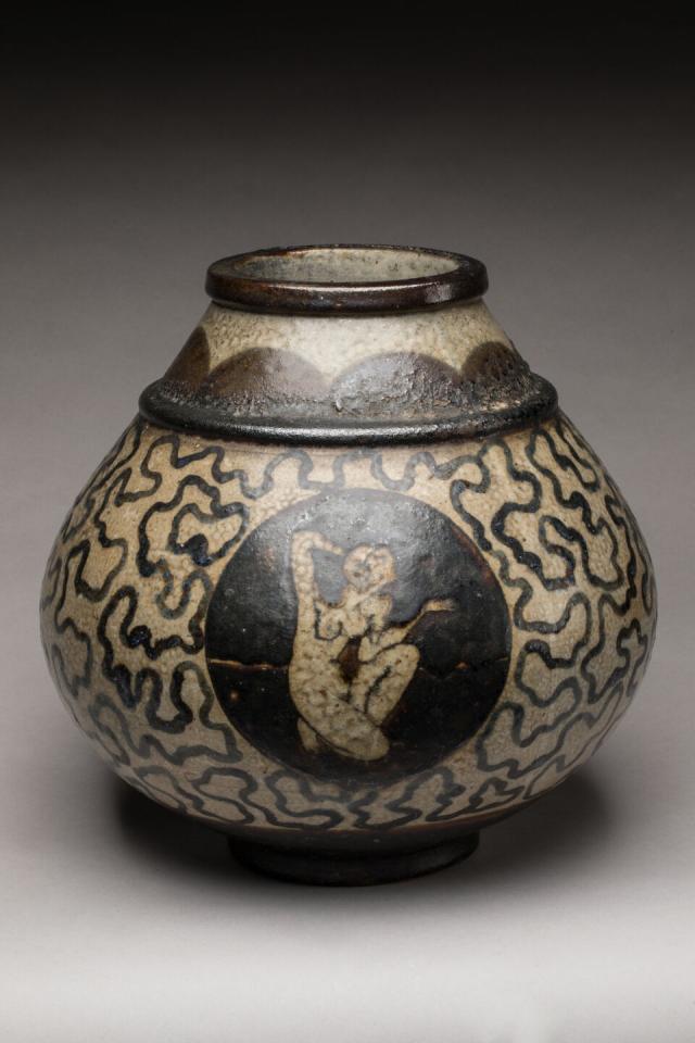 Vase de forme pansue en céramique polychrome à décor de femmes nues en cartouches. Signé. H. 30 cm
