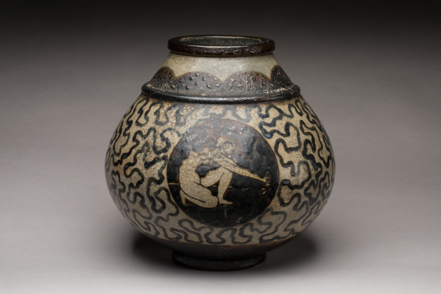 Primavera / Sainte-Radegonde Vase de forme pansue en céramique polychrome à décor de femmes nues en cartouches. Signé. H. 30 cm TR