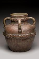 Vase pansu à quatre anses appliquées en céramique dans les tons de brun rouge. Signé et numéroté 1082. H. 32 cm