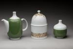 Théière et sucrier en porcelaine blanche et verte. H. théière 16 cm