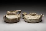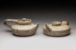 Deux théières en grès gris beige. Portent la signature apocryphe de Gilbert Portanier. D. 17 et 18 cm