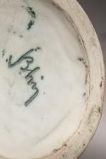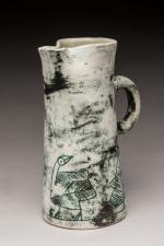 Jacques Blin (1920-1995) Pichet de forme cylindrique en céramique beige marbrée à décor stylisé d'oiseau et...