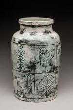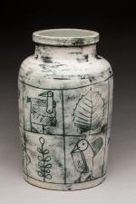 Jacques Blin (1920-1995) Vase de forme cylindrique en céramique grise bleutée à décor ciselé d'oiseaux. Signé. H. 22 cm TR