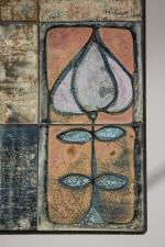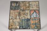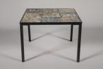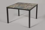 Table basse de forme carrée à structure en métal laqué noir et plateau en céramique à décor abstrait ou floral. H. 34 cm L. 46,5/46,5 cm.