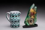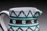 Pichet à anse en céramique beige à décor géométrique vert et brun de chevrons et divers motifs. Minuscules égrenures en bordure. Monogrammé. H. 16 cm