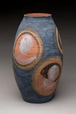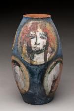 Vallauris Grand vase en terre polychrome à décors en cartouches. Situé et signé illisible, daté 2000. H. 37 cm TR
