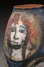 Grand vase en terre polychrome à décors en cartouches. Situé et signé illisible, daté 2000. H. 37 cm