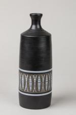 Vase bouteille en céramique noire à décor en frise stylisé en partie basse. Signé. H. 27 cm