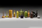 Ensemble de cinq soliflores en céramique de diverses couleurs, vert, violet, jaune, orangé. Signés. H. 20 à 24 cm