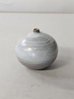 Petit vase boule en céramique grise striée. Signé. H. 8 cm