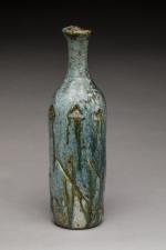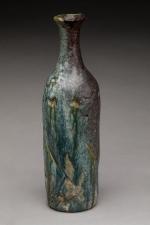 Vase bouteille en céramique à coulures dans les tons de vert et noir, décor stylisé en creux. H. 30 cm. TR