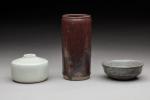 Trois pièces en céramique de diverses couleurs, un vase cylindre, un vase bas et une coupelle. Signées. H. 5 à 14 cm