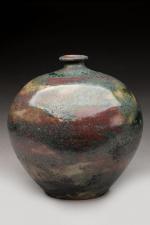 Michel Lanos (1926-2005) Petit vase boule en céramique dans les tons de vert et bordeaux. Monogrammé en-dessous. H. 16 cm TR