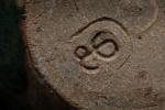 Petit vase boule en céramique dans les tons de vert et bordeaux. Monogrammé en-dessous. H. 16 cm