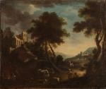 ÉCOLE FLAMANDE du XVIIIe siècle Paysan et animaux se reposant près du feu Toile 47 x 56 cm. Rentoilé, griffures, accidents. RM