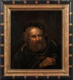 ECOLE HOLLANDAISE du XVIIIe siècle, dans le goût de REMBRANDT Homme tenant une loupe Toile 62 x 54 cm Rentoilé. RM