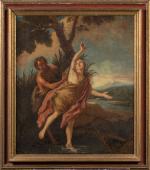 ECOLE FRANCAISE du XVIIIème siècle, entourage de Antoine COYPEL Pan et Syrinx Toile 82,5 x 70,5 cm Restaurations et manques, rentoilé. RM