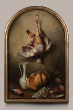 E.REYNIER, école française du XIXème siècle. Nature morte à la perdrix et à la courge. Huile sur...