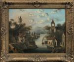 TABLEAU HORLOGE. Paysage lacustre animé avec clocher et moulin. Mécanisme à sonnerie à la demande et sur horloge à six aires. Époque Napoléon III. Cadre en bois doré de style Louis XV. Dimensions hors tout : 88 x 103 cm. Petits accidents et restaurations.