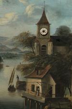 TABLEAU HORLOGE. Paysage lacustre animé avec clocher et moulin. Mécanisme à sonnerie à la demande...