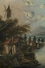 TABLEAU HORLOGE. Paysage lacustre animé avec clocher et moulin. Mécanisme...