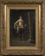 Charles-François PECRUS (1826-1907). Mousquetaire devant un tableau. Huile sur toile. Signé en bas à gauche. 61 x 43,5 cm. Accidents. OH
