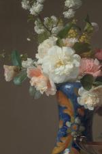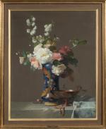 François RIVOIRE (1842-1919). Bouquet dans un vase en porcelaine et coupe en cuivre, 1875. Gouache sur papier. Signé...