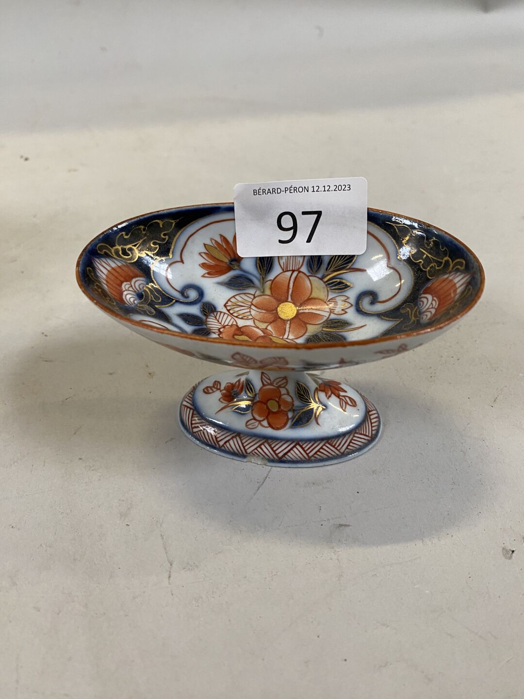 BAGUIER en porcelaine de Bayeux façon imari. Un petit éclat à la base. H. 6 cm.