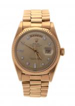 ROLEX - MONTRE modèle "Day-Date" - Ref 1803 N° 36045XX - Boîtier rond en or jaune 750/°° , lunette cannelée en or - Diam. 36 mm hors couronne - mouvement automatique - Cadran doré, index diamants, date à 3h - bracelet maille Président, en or jaune, sur sa boucle déployante Rolex en or (bracelet présentant une distention/du stretch) - Vers 1974 - Non ouverte - Fonctionne à la rédaction du catalogue, prévoir révision d'usage. PB: 122,40g. Avec facture d'achat de 2014.