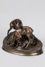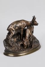 Pierre-Jules MENE (1810-1879). "Couple de chevreuils, 1859". Sujet en bronze à patine brune signé et daté sur la terrasse. Fonte d'atelier. 27 x 32 cm.