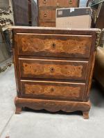 COMMODE marquetée à dessus de marbre ouvrant à trois tiroirs,...