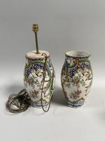 Paire de VASES balustres en faïence à décor dans le style de Rouen. Epoque XIXe siècle. H: 33cm. Montés en lampes. Petits éclats. Chocs à la base et cheveux.