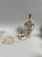 VASE couvert balustre en faïence à décor dans le style de Rouen. Époque XIXe siècle. H: 45 cm. Monté en lampe. Éclats.